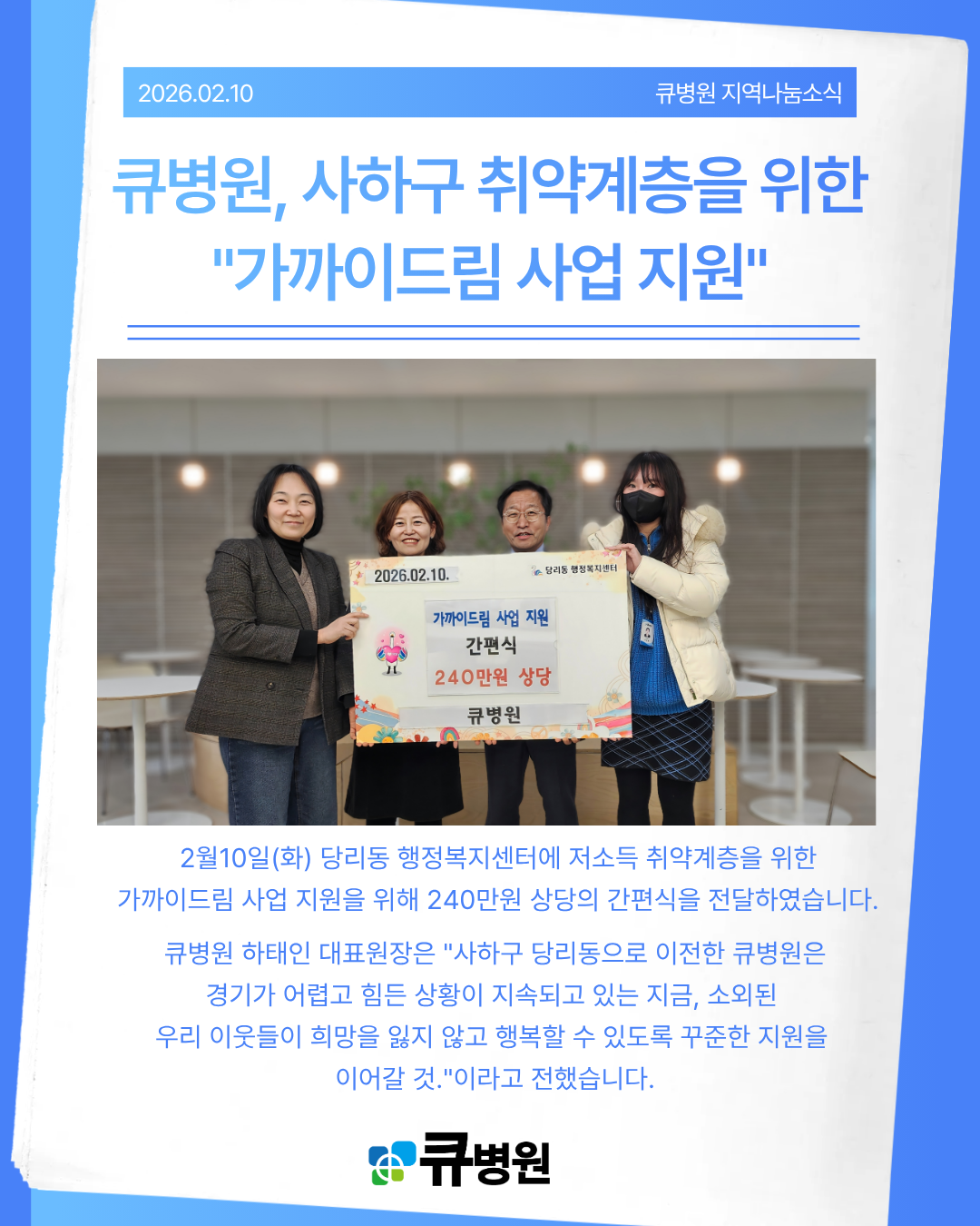 병원소식 큐병원, 사하구 취약계층을 위한 "가까이드림 사업 지원" 페이지 정보 작성자큐병원 등록일 2026-02-10 16:31 조회21 본문 목록 다음글큐병원 설날 연휴 진료안내 26.02.04